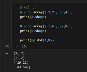 이 코드에서 A와 B는 2x2 행렬이며 이들 두 행렬의 곱은 넘파이 함수 np.dot()으로 계산한다.