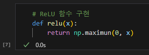 위처럼 파이썬에서는 넘파이의 maximun 함수를 사용해 ReLU 함수를 구현할 수 있다.