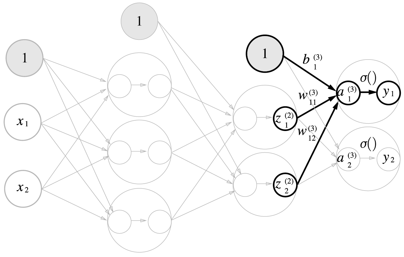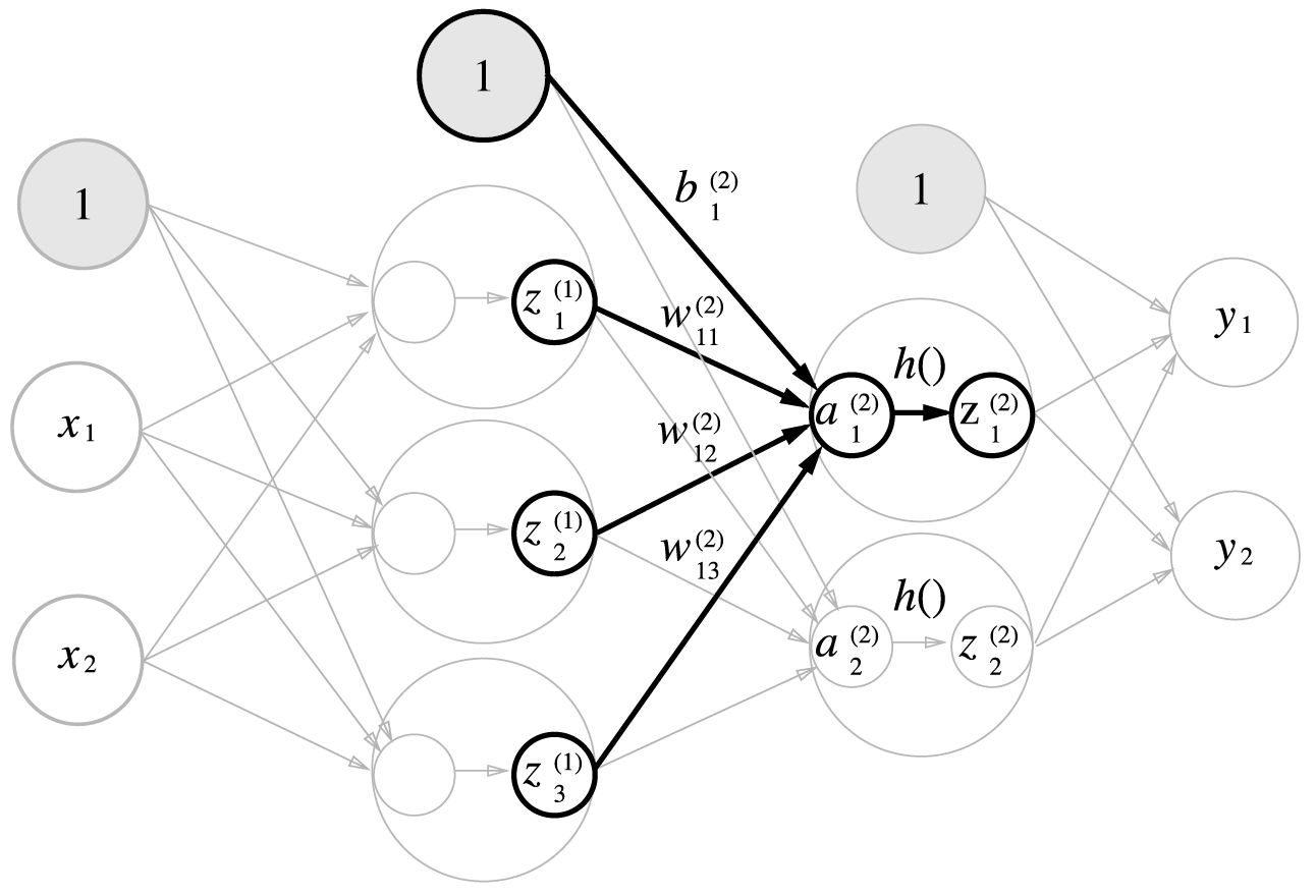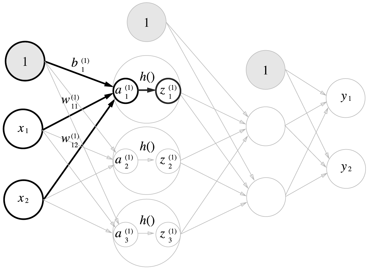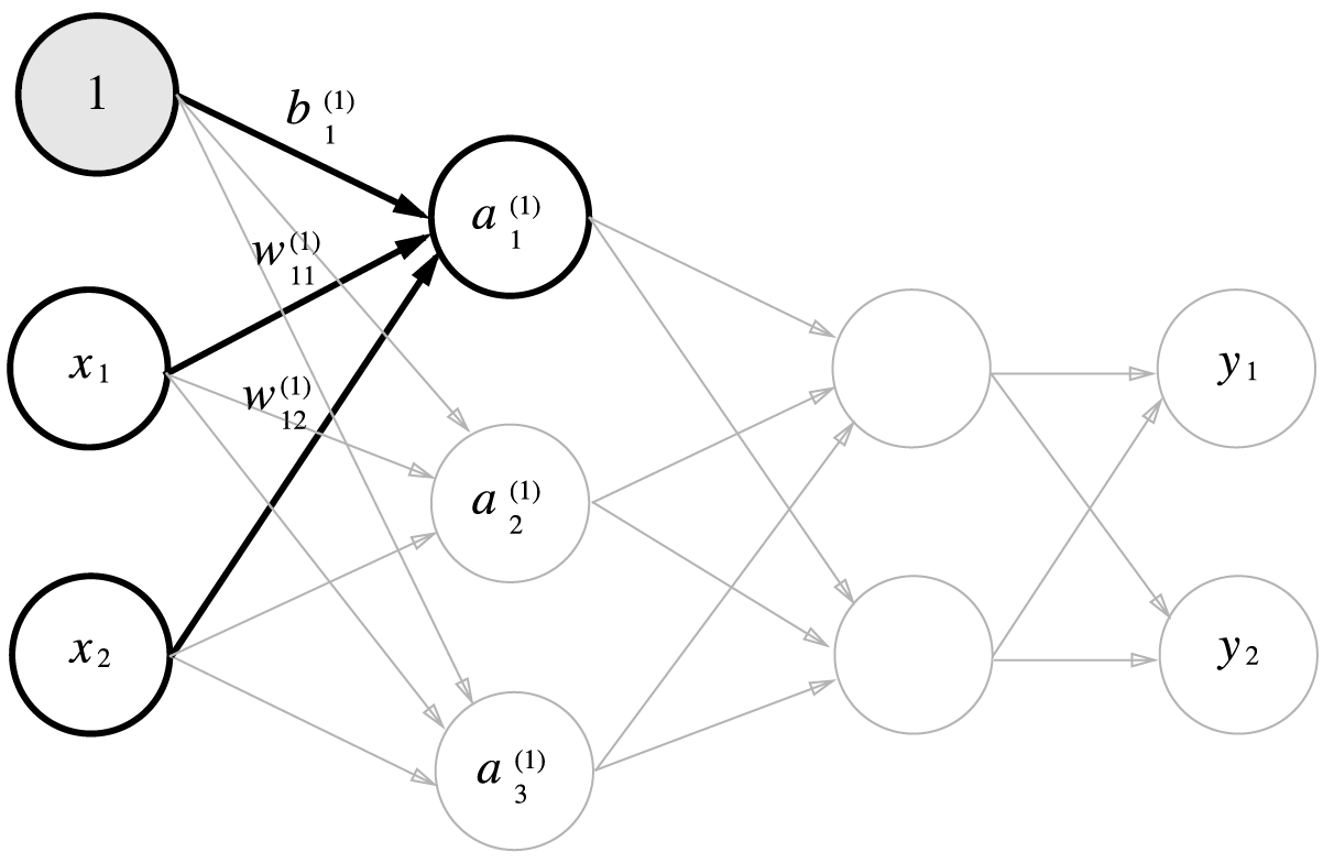 가중치와 은닉층 뉴런의 오른쪽 위에는 (1)이 붙어 있으며 이는 1층 가중치, 1층 뉴런임을 의미한다.