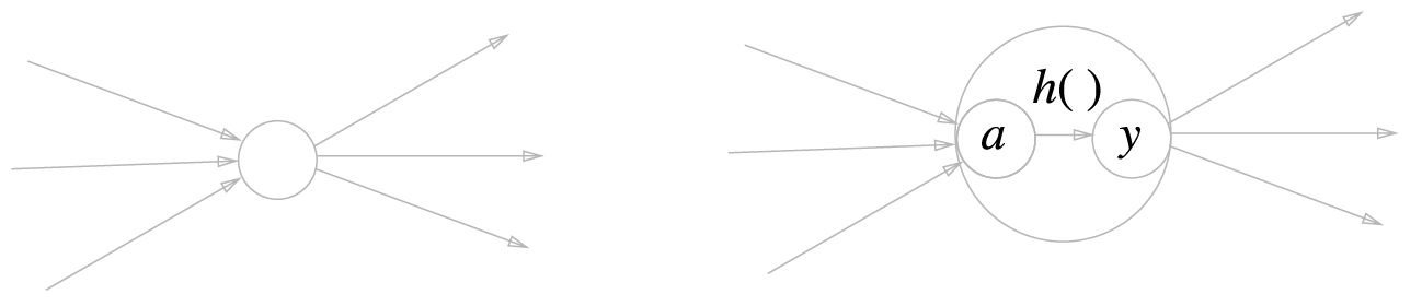 그림 3-5의 왼쪽처럼 뉴런을 하나의 원으로 그리지만, 신경망의 동작을 더 명확히 드러내고자 할 때 오른쪽 그림처럼 활성화 처리 과정을 명시하기도 한다.