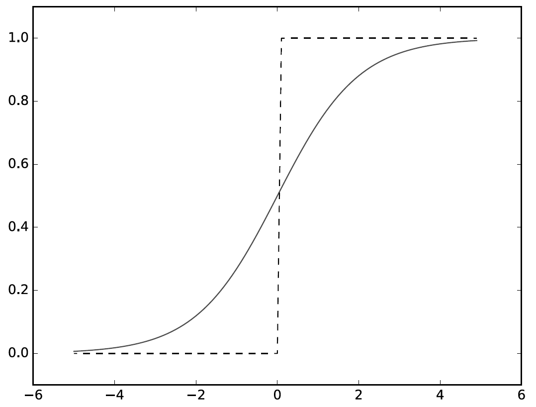 또, 계단함수가 0과 1 중 하나의 값만 돌려주는 반면 시그모이드 함수는 실수를 돌려준다는 점도 다르다.
