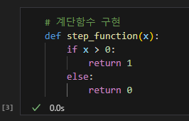 계단 함수는 입력이 0을 넘으면 1을 출력하고 그 외에는 0을 출력하는 함수이다.