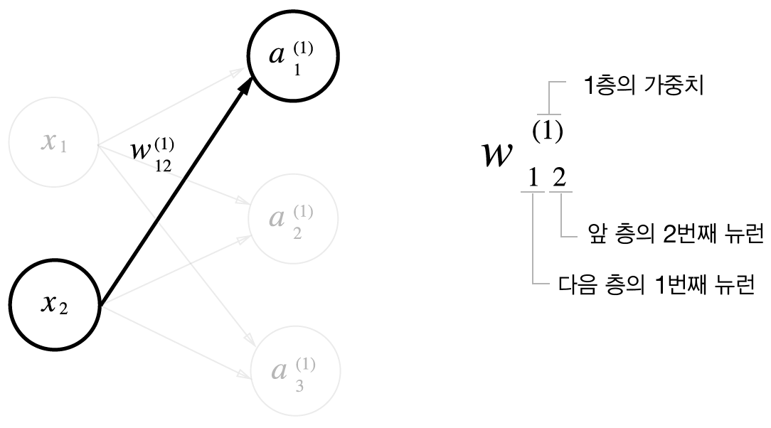가중치의 오른쪽 아래 두 숫자는 차례로 다음 층 뉴런과 앞 층 뉴런의 인덱스 번호이다.