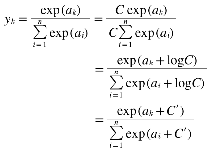 이는 소프트맥스의 지수 함수를 계산할 때 어떤 정수를 더해도 결과는 바뀌지 않는다는 것을 말하고 있다.