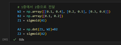이는 1층의 출력 Z1이 2층의 입력이 된다는 점을 제외하면 이전 구현과 동일하지만 활성화 함수만 지금까지의 은닉층과 다르다.