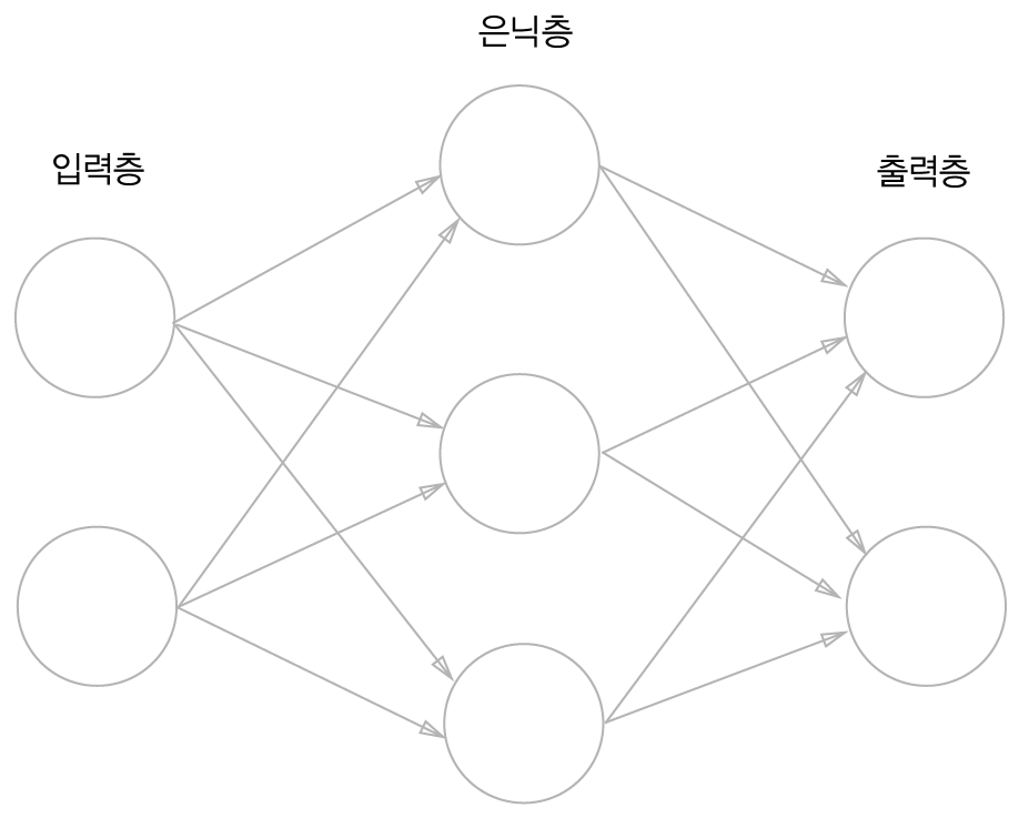 신경망을 그림으로 나타내면 그림3-1처럼 된다. 가장 왼쪽 줄을 입력층, 맨 오른쪽 줄을 출력층, 중간 줄을 은닉층이라고 한다. 은닉층의 뉴런은 사람 눈에는 보이지 않는다.