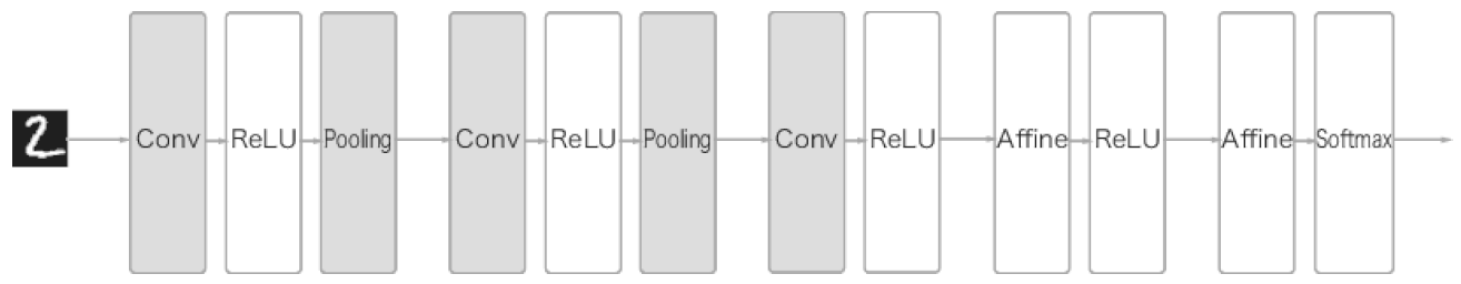 CNN에서 출력에 가까운 층에서는 지금까지의 Affine-ReLU 구성을 사용할 수 있다. 또 마지막 출력 계층에서는 affine-softmax 조합을 그대로 사용한다.