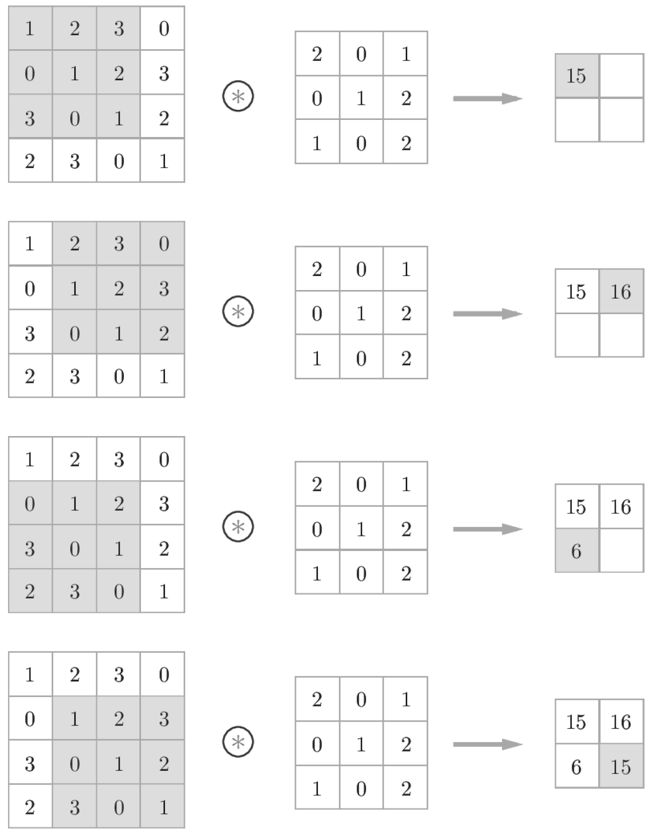 이 과정을 모든 장소에서 수행하면 합성곱 연산의 출력이 완성된다.