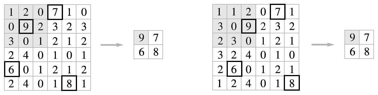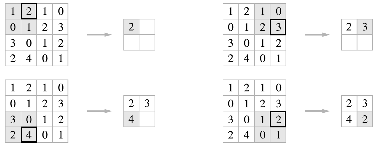 위 예시에서는 스트라이드를 2로 설정했으므로 2x2 윈도우가 원소 2칸 간격으로 이동한다.