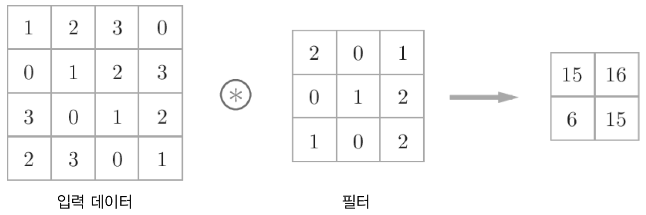 그림 7-3과 같이 합성곱 연산은 입력 데이터에 필터를 적용한다. 데이터와 필터의 형상을 (높이 height, 너비 width)로 표기한다. 문헌에 따라 필터를 커널이라 칭하기도 한다.