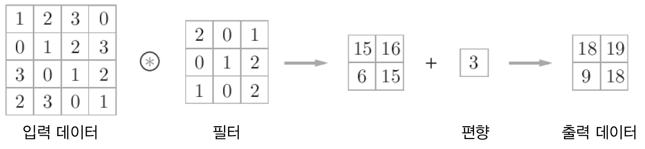 편향은 필터를 적용한 후의 데이터에 더해지며 편향은 항상 하나만 존재한다. 이 하나의 값을 필터를 적용한 모든 원소에 더하는 것이다.