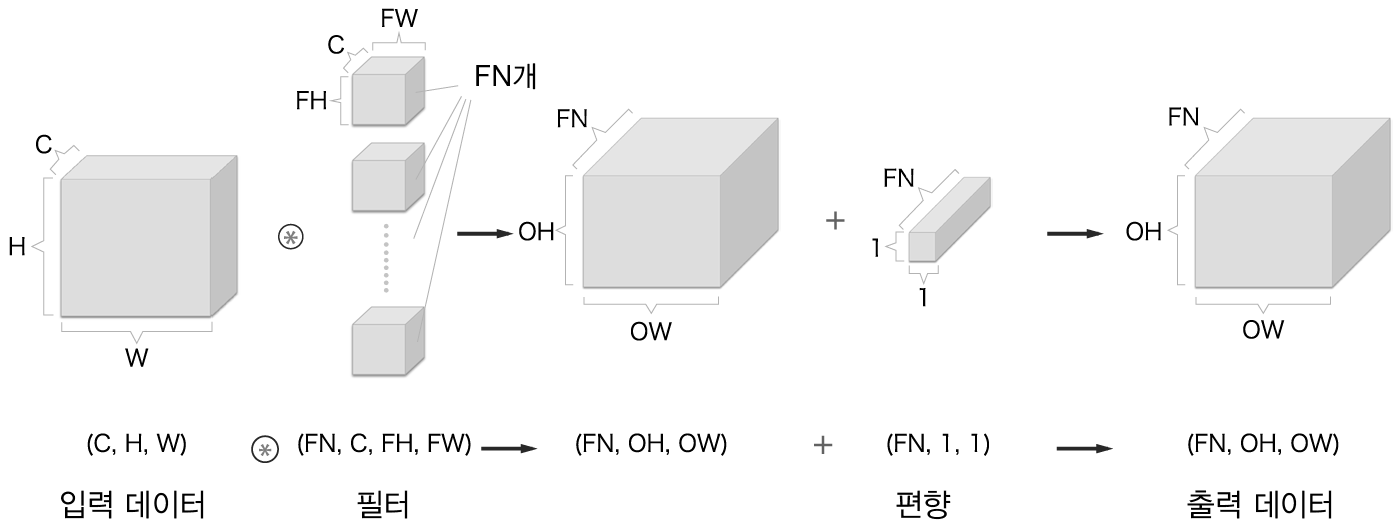주의해야 할 점은 신경망에 4차원 데이터가 하나 흐를 때마다 데이터 N개에 대한 합성곱 연산이 이뤄진다는 것이다. 즉, N회 분의 처리를 한번에 수행하는 것이다.