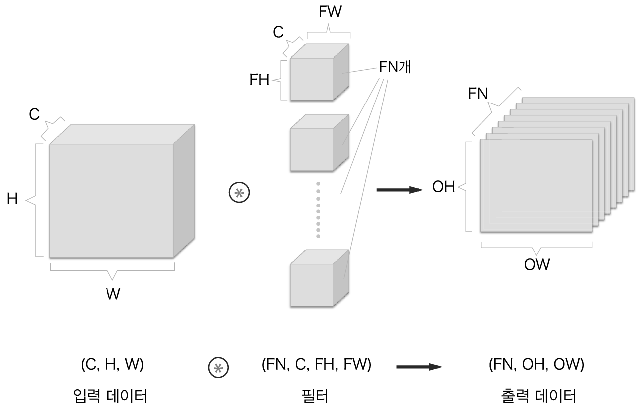 합성곱 연산에서는 필터의 수도 고려해야 한다. 따라서 필터의 가중치 데이터는 4차원 데이터이며 (출력 채널 수, 입력 채널 수, 높이, 너비) 순으로 쓴다.
