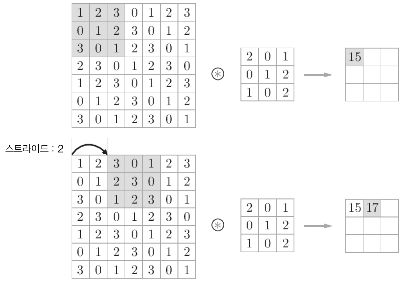 스트라이드를 2로 하면 필터를 적용하는 윈도우가 두 칸씩 이동하게 된다.