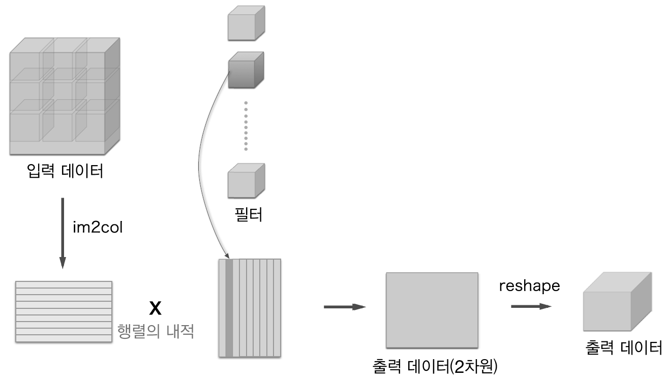 그림 7-19와 같이 im2col 방식으로 출력한 결과는 2차원 행렬이다. CNN은 데이터를 4차원 배열로 저장하기 때문에 2차원 출력의 데이터를 4차원으로 reshape 한다.