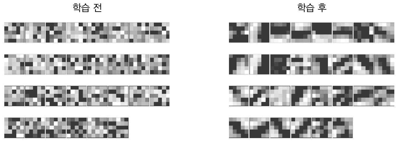 그림 7-24와 같이 학습 전 필터는 무작위로 초기화 되고 있지만 학습 후 필터는 엣지(색상이 바뀐 경계선)와 블롭(국소적으로 덩어리진 영역)을 보고 있다.