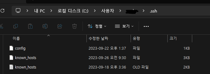 C:\Users\{윈도우 user 이름}\.ssh -> 이 경로에 가면 아래 사진처럼 known_hosts 파일들이 있다.
