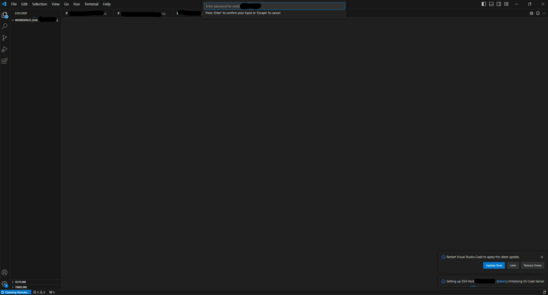 이렇게 .vscode-server/ 폴더를 지운 후 다시 vscode에서 ssh로 컨테이너에 연결하면 비밀번호 입력 후 환경 설치가 진행되고 정상적으로 사용이 가능하게 된다.