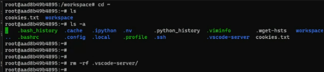보통은 ubuntu 서버 같은 원격으로 연결한 서버의 터미널 창에서 home 경로에 있는 .vscode-server 폴더를 지우면 해결 되지만 나는 컨테이너 터미널에서 home 경로로 이동 후 .vscode-server 폴더를 지워야 했다.