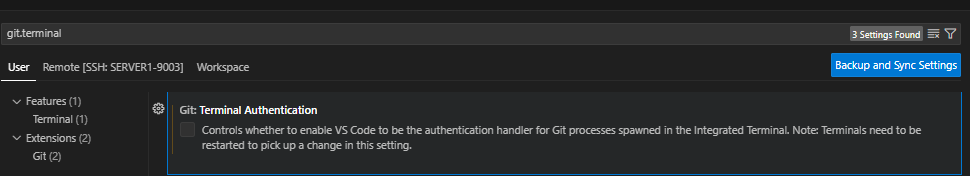 그래서 vscode setting에서 git terminal을 검색하여 Terminal Authentication을 해제 해 주면 된다!