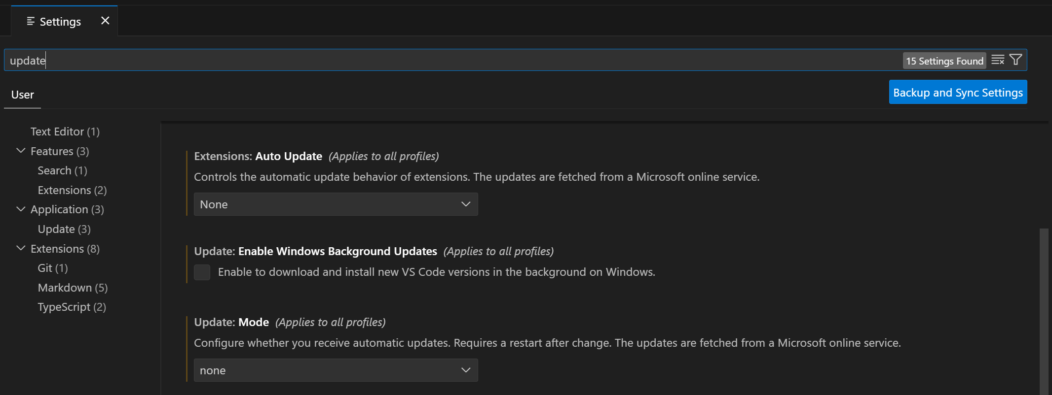 여기서 update라고 검색하면 Update : Mode가 있는데 이걸 none으로 해 주면 자동 업데이트를 끌 수 있다.