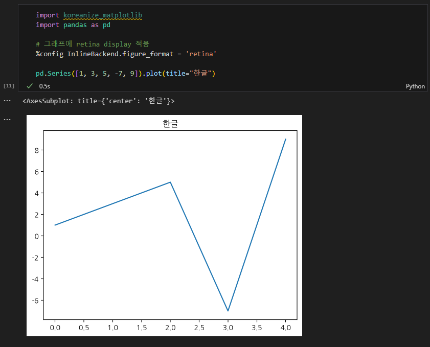 koreanize_matplotlib를 설치하고 주피터 노트북 쉘에서 그래프에 retina display를 적용한 후 위 코드처럼 아무거나 만들어서 plot을 그렸더니 한글이 제대로 출력이 되었다!!!!