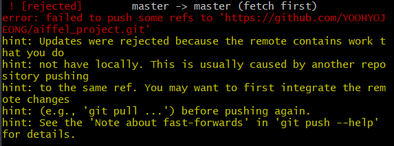 기존 원격 저장소와 새 로컬 저장소의 업데이트 상태가 같지 않았던 것 이다.