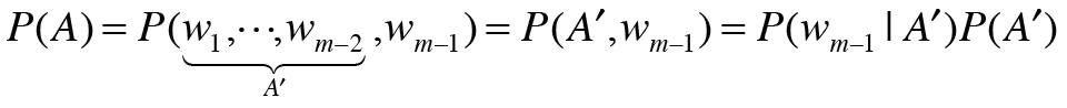 이 동시 확률 P(w1, ..., wm)은 사후 확률을 사용하여 다음과 같이 분해하여 쓸 수 있다.