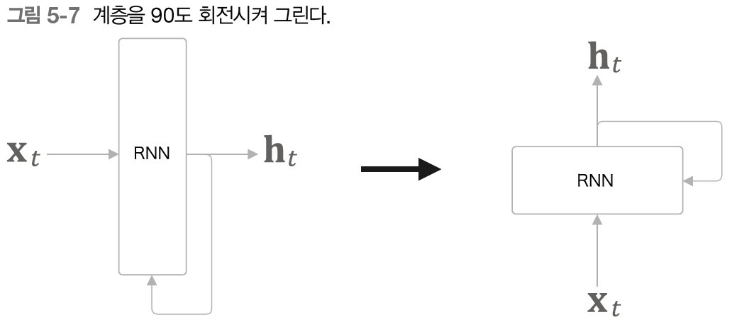 RNN 계층의 순환 구조를 펼침으로써 오른쪽으로 성장하는 긴 신경망으로 변신시킬 수 있다.