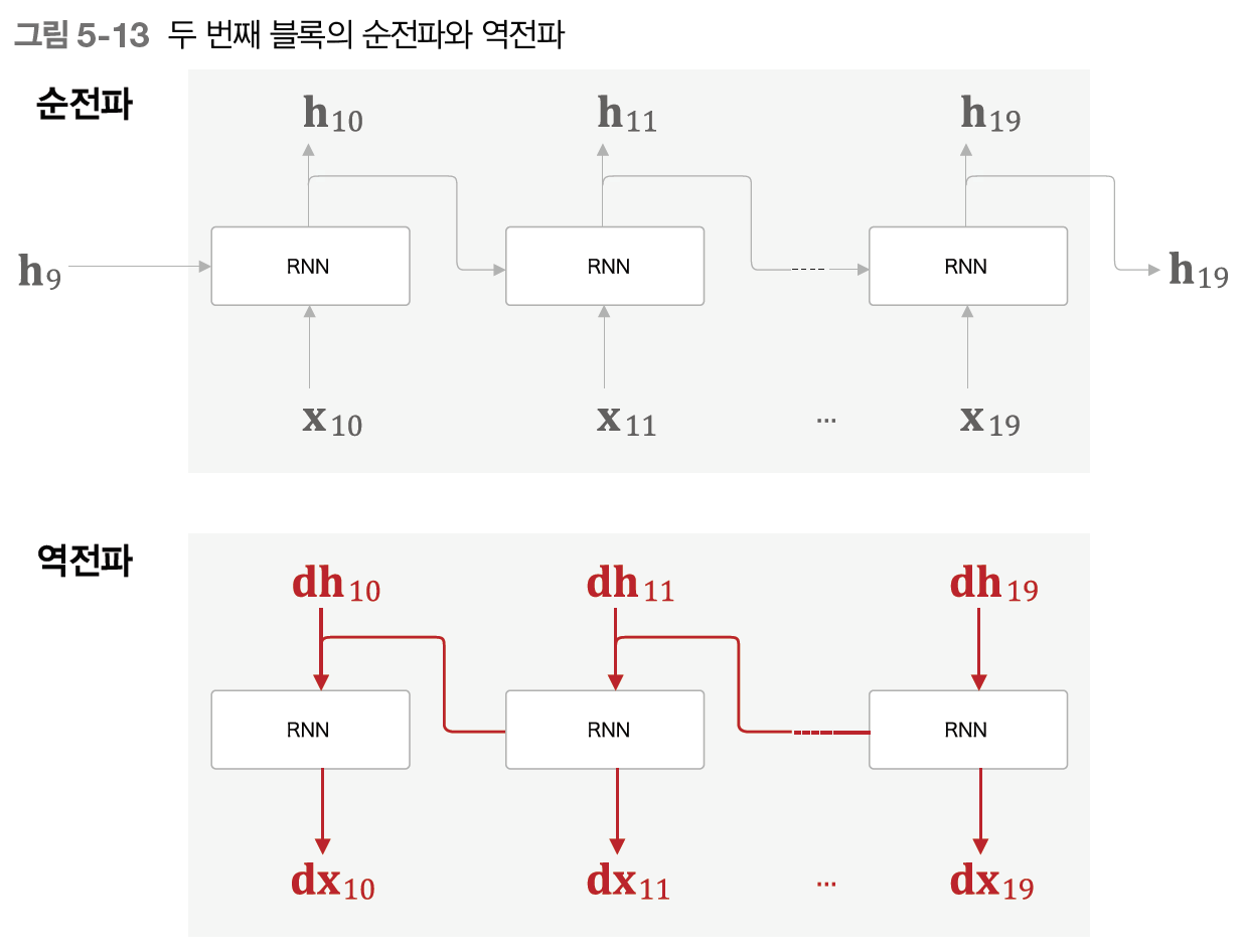 - 긴 시계열 데이터를 학습할 때는 데이터를 적당한 길이씩 모으로 블록 단위로 BPTT에 의한 학습을 수행한다.