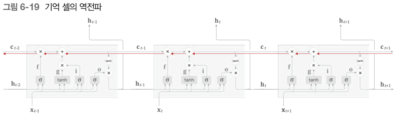 위 6-19 그림의 x노드의 계산은 forget 게이트가 제어한다. forget 게이트가 잊어야 한다고 판단한 기억 셀의 원소에 대해서는 그 기울기가 작아지는 것이다.