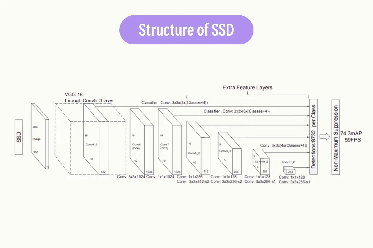 Single shot detection은 bounding box와 객체의 class를 한번의 shot으로 예측하느 객체 가지 알고리즘의 한 유형이다. 네트워크의 단일 forward로 객체의 존재와 bounding box가 동시에 예측이 된다.