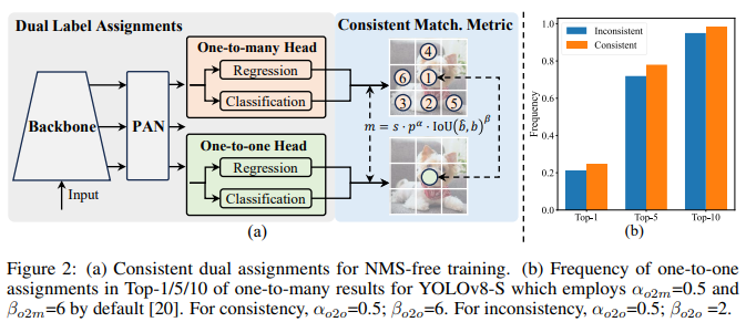 - 기존 YOLO 아키텍쳐는 NMS에 대한 의존성이 높아 정확도는 향상시키지만 latency를 초래함.