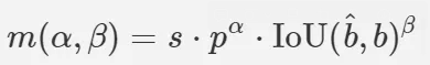 p는 분류 점수, bhat과 b는 각각 예측과 인스턴스의 bbox, s는 예측의 앵커 포인트가 인스턴스 내에 있는지를 나타내는 공간의 사전 정보로 예측과 실제 인스턴스의 IoU 정보를 활용한다.