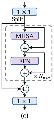 1×1 컨볼루션 후에 채널 전반에 걸쳐 특징을 두 부분으로 균등하게 분할 하며 멀티 헤드 셀프 어텐션 모듈(MHSA)과 피드 포워드 네트워크(FFN)으로 구성된 𝑁𝑃𝑆𝐴 블록에 한 부분만 입력한다. 이후 그 다음 두 부분을 연결하고 1×1 컨볼루션으로 융합한다.