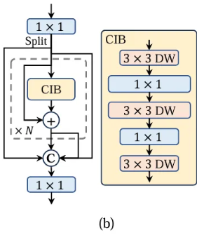 또, 공간 혼잡을 위한 저렴한 depthwise convolution과 채널 혼합을 위한 비용 효율적인 pointwise convolution을 채택한 컴팩트 인버티드 블록(CIB) 구조를 제시한다.