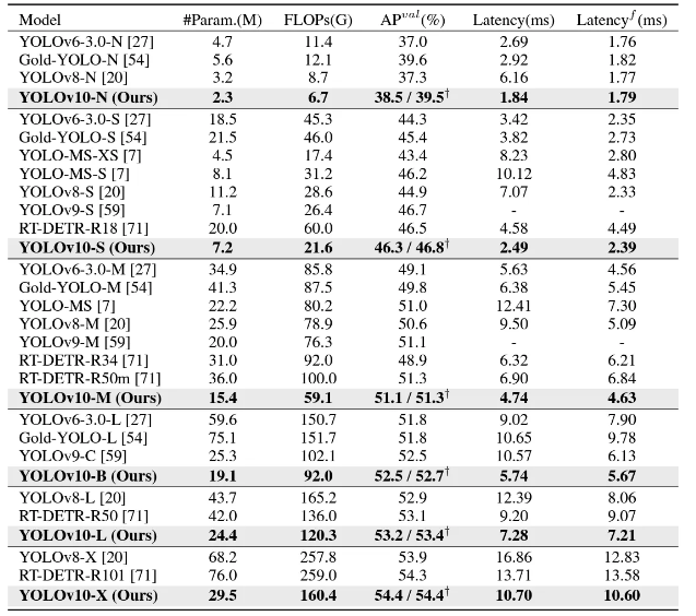Latencyf 은 NMS 후처리 없는 지연 시간을 나타내며 †는 일대다 헤드를 사용한 YOLOv10의 결과를 나타내고 없는 것이 일대일 헤드의 결과이다.