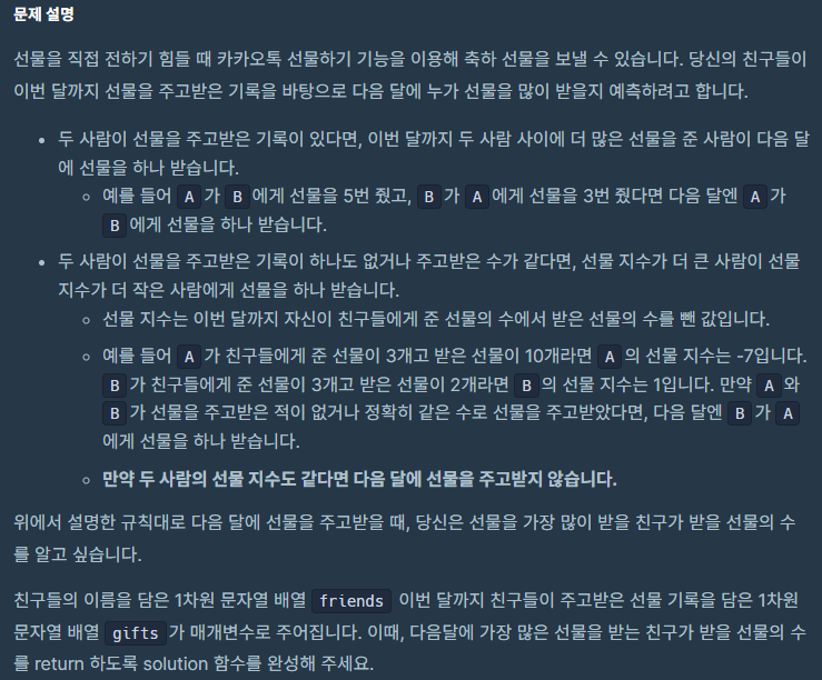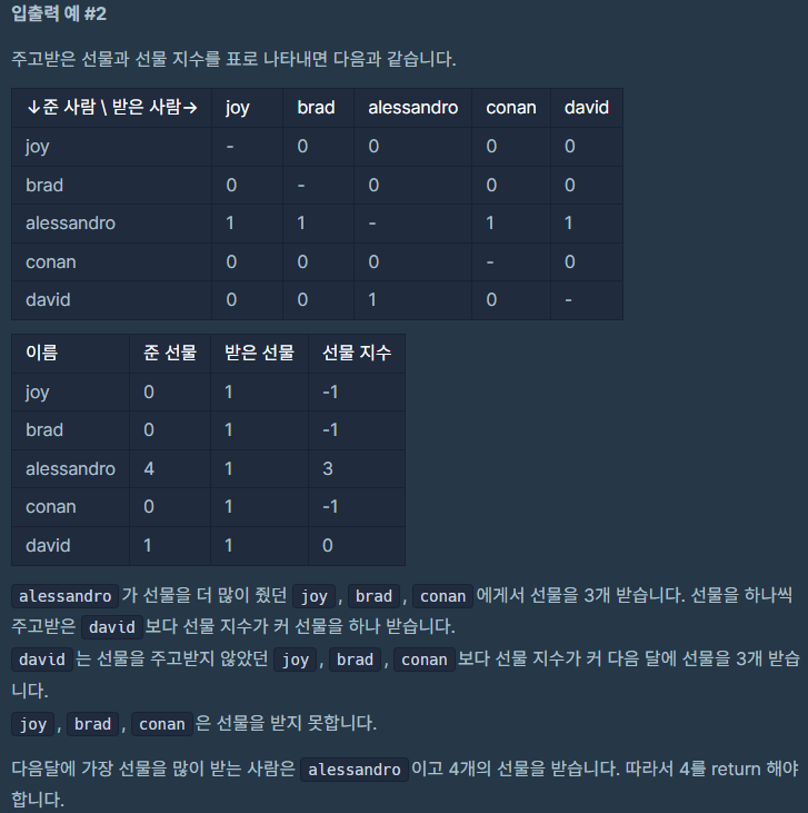 준 선물의 개수가 i>j인 경우 i가 선물을 하나 받고, 준 선물의 개수가 같으면 선물 지수가 i가 j보다 큰 경우에 i가 선물을 받도록 했다.