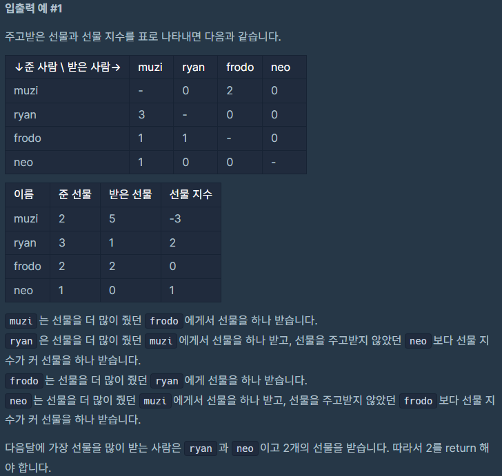 선물 준 사람은 +1, 선물을 받은 사람은 -1이 되도록 선물 지수를 계산을 했고 2중 for문을 돌면서 다음 달에 받을 선물 개수를 구하고자 했다.
