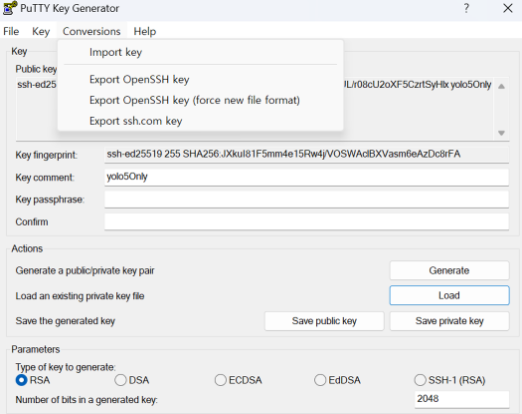 상단의 conversions에서 "Export OpenSSH key"를 선택하면 원하는 경로에서 원하는 이름으로 ssh key를 생성하게 된다.