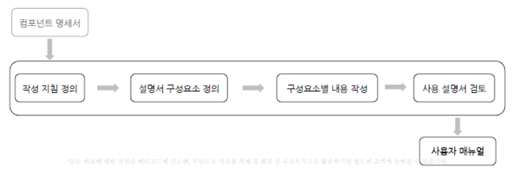 - 명세서 -> 작성 지침 정의 -> 설명서 구성요소 정의 -> 구성요소 별 내용 작성 -> 사용 설명서 검토 -> 사용자 매뉴얼 순서대로 작성