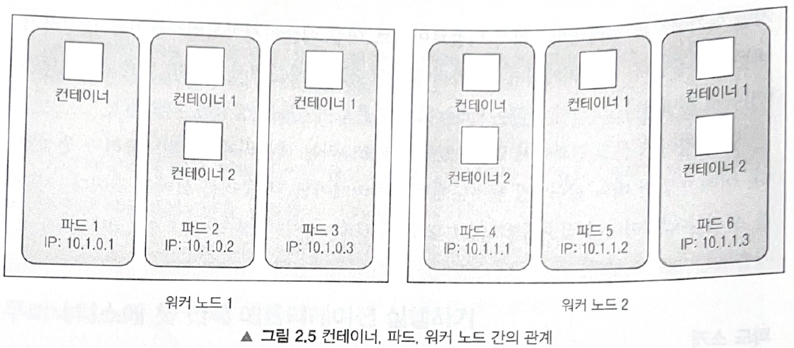 - 고유한 IP와 애플리케이션 프로세스를 실행하는 하나이상의 컨테이너를 가짐.