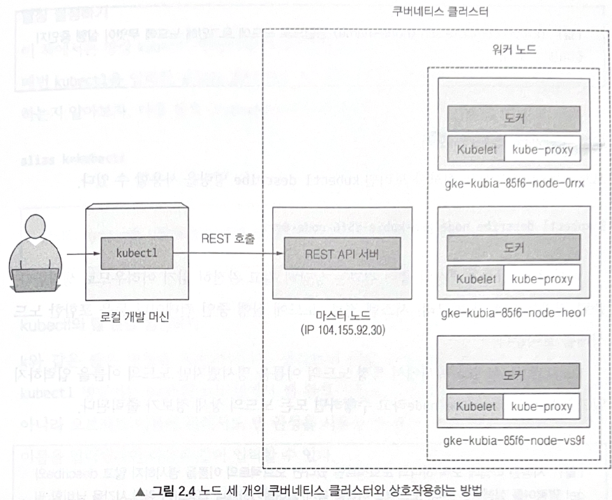 - kubectl 클라이언트 명령어는 마스터 노드에서 실행 중인 쿠버네티스 API 서버로 REST 요청을 보내 클러스터와 상호작용 한다.