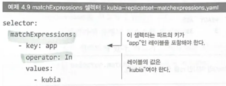 - 레플리카셋의 셀렉터는 특정 레이블이 없는 파드나 레이블의 값과 상관없이 특정 레이블의 키를 갖는 파드를 매칭시킬 수 있음.