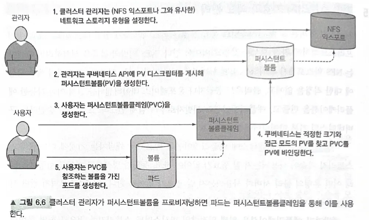 - 개발자가 파드에 기술적인 세부 사항을 기재한 볼륨을 추가하는 대신 클러스터 관리자가 기반 스토리지를 설정하고 쿠버네티스 API 서버로 퍼시스턴트 볼륨 리소스를 생성해 쿠버네티스에 등록함.