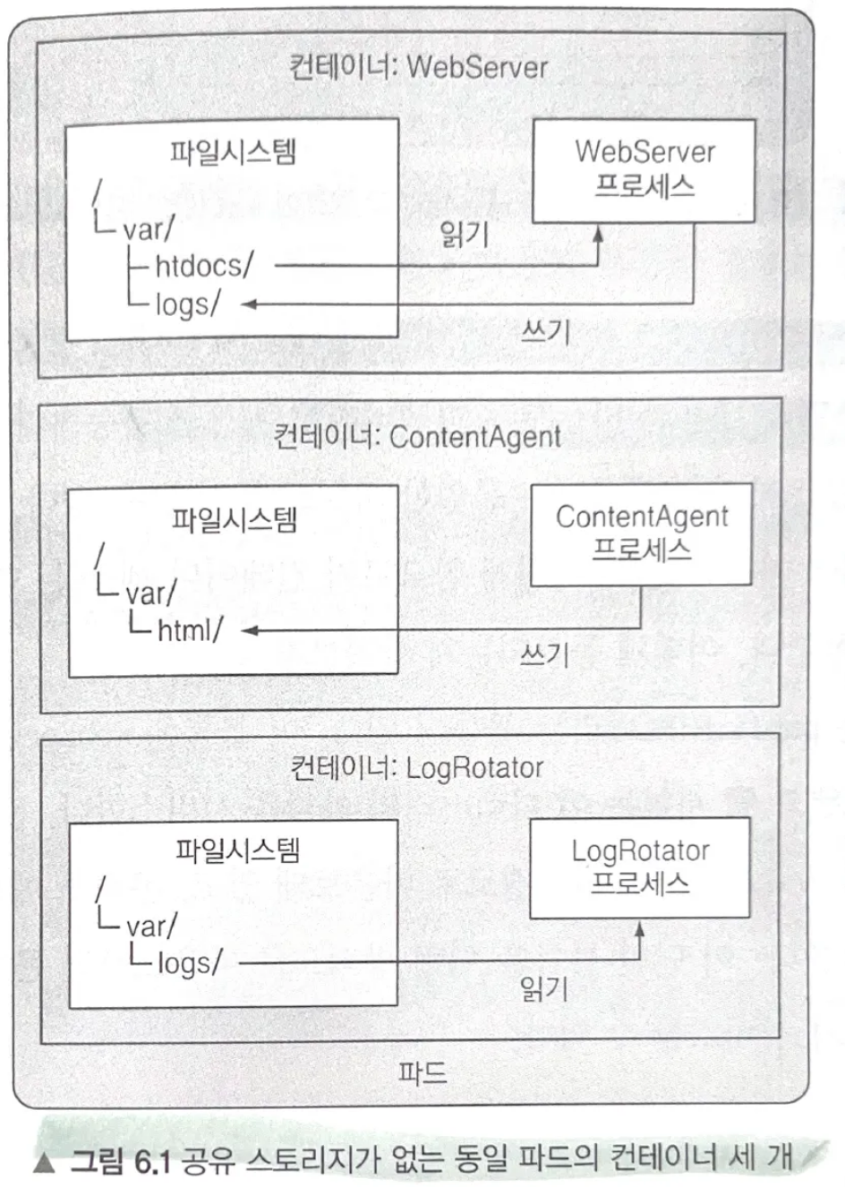 - 세 컨테이너 간에 디스크 스토리지를 공유하지 않는 파드를 생성하는 것은 의미가 없음.