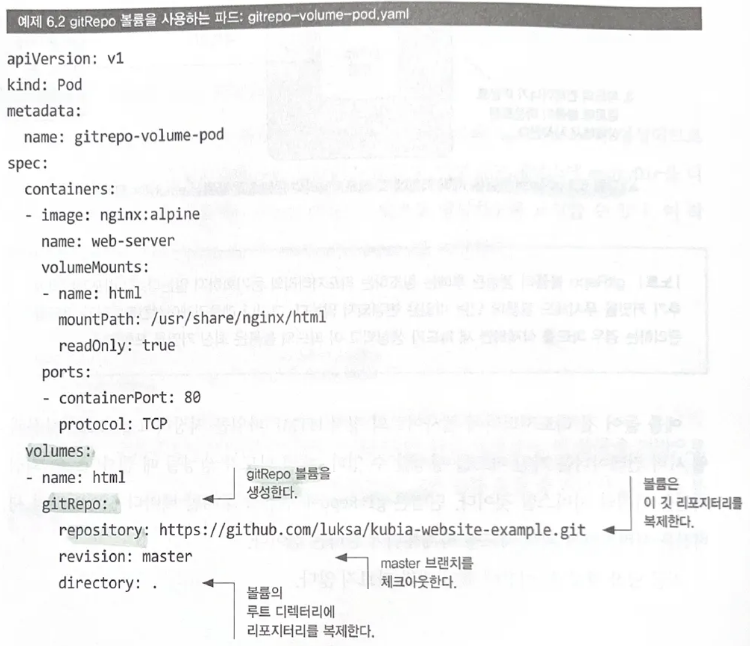 - 깃 리포지터링 웹사이트의 정적 HTML 파일을 저장하고 gitRepo 볼륨과 웹 서버 컨테이너를 가진 파드를 생성할 수 있음.