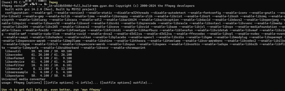 환경 변수를 제대로 설정 했다면 powershell에서 ffmpeg을 실행하여 제대로 설치되었는지 확인하면 된다.