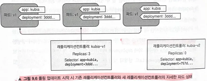 롤링 업에이트 프로세스는 첫번째 레플리케이션컨트롤러의 셀렉터도 수정함.