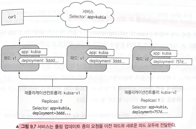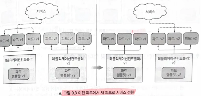 이 경우 서비스의 파드 셀럭터에 이전 파드와 새 파드를 모두 포함하게 해 요청을 두 파드 세트로 보낼 수 있음.